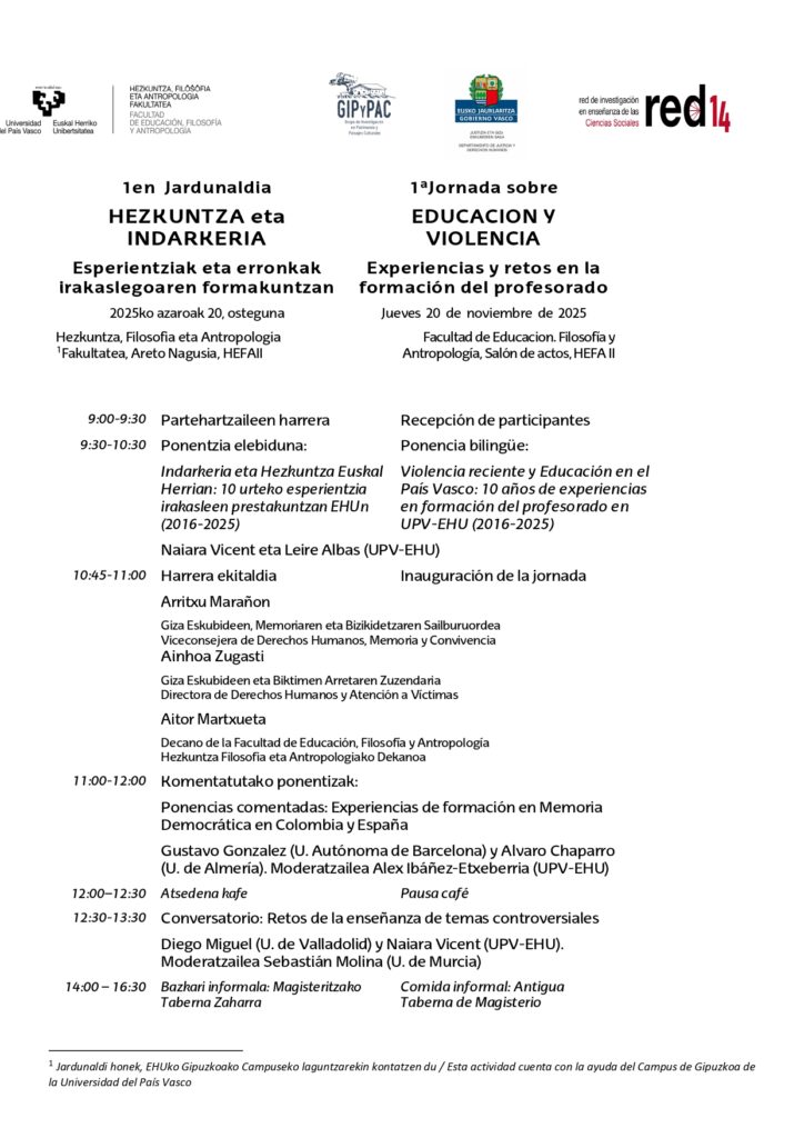 2025eko azaroaren 20an, EHUko Hezkuntza, Filosofia eta Antropologia Fakultatean (HEFA II), HEZKUNTZA ETA INDARKERIA: irakaslegoaren formakuntzako esperientziak eta erronkak izeneko lehen jardunaldia egingo da. Gipuzkoako Campuseko laguntzarekin antolatutako ekimen honek gai eztabaidagarrien irakaskuntzari, memoria demokratikoari eta hezkuntzak indarkeriazko testuinguruetan duen paperari buruzko hausnarketa eta elkarrizketarako gunea sortzea du helburu. Hainbat unibertsitatetako profesionalek partekatutako hitzaldi, elkarrizketa eta esperientzien bidez, jardunaldiak irakasleen prestakuntza aberastu eta giza eskubideekiko eta bizikidetzarekiko begirada kritiko eta konprometitua sustatu nahi du.